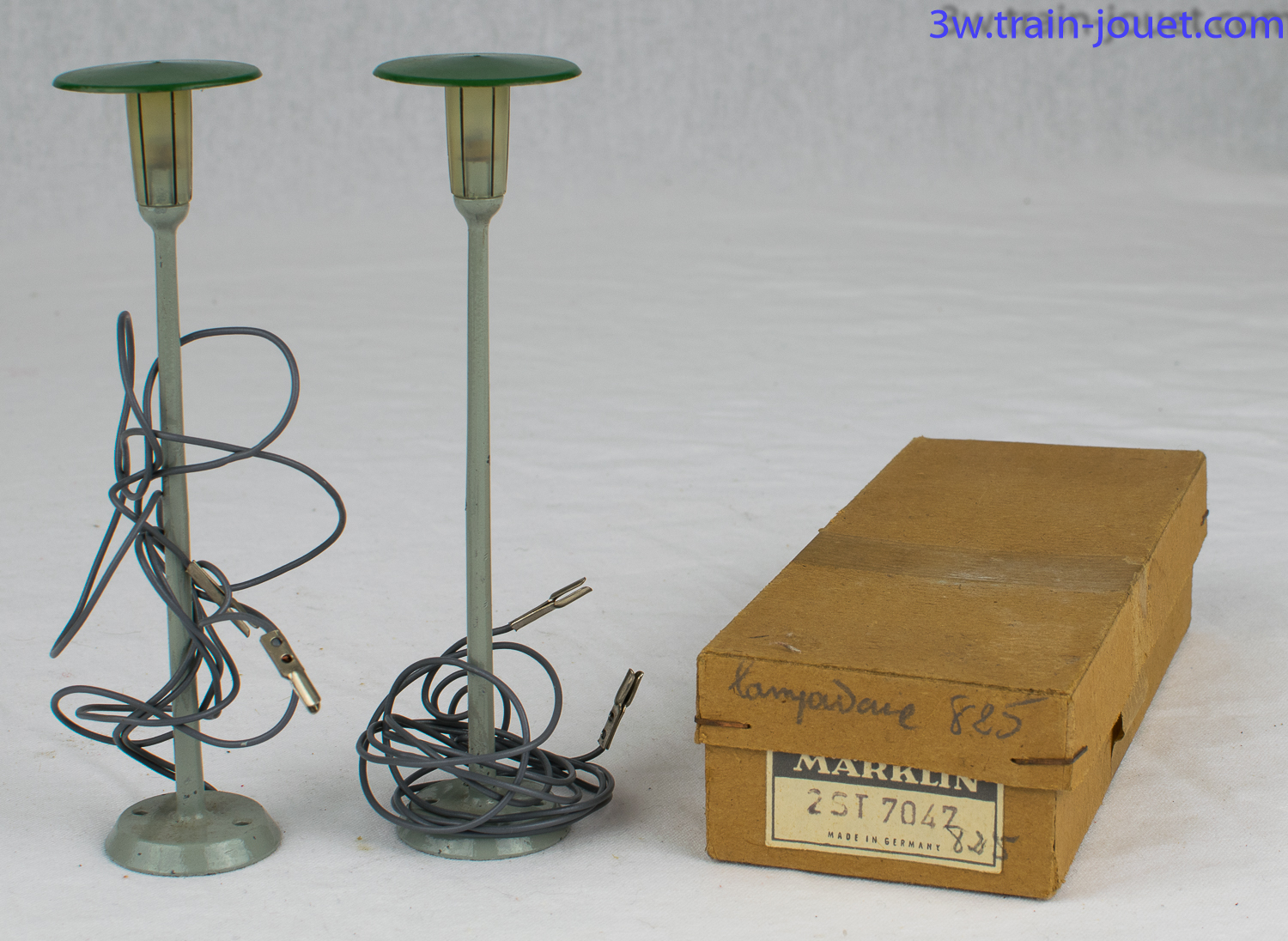 Deux anciennes boîtes Märklin contenant, pour l'une deux lampadaires (Réf 7047 - 2 ST), pour l'autre un contacteur et des fils (Réf sur boîte 7072). |